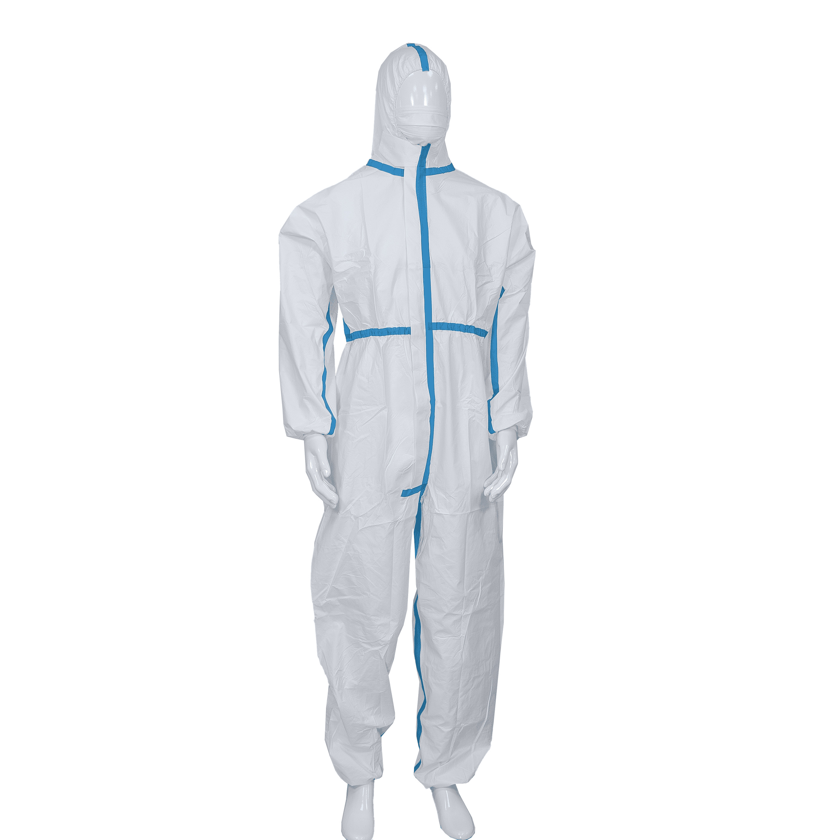 پوشش حفاظتی یکبار مصرفی با نوار آبی با هود و مچ دست / مچ پا / کمر انعطاف پذیر برای جلوگیری از کثافت