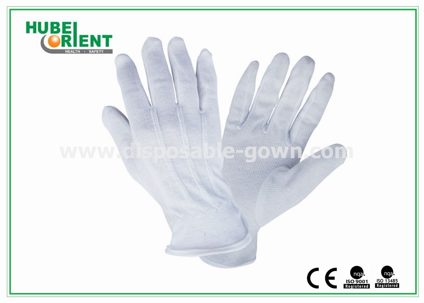 نام محصولات | محیط زیست دوستانه یکبار مصرف 100٪ نرم پنبه خالص دستکش با نقطه های PVC رنگ سفید |
